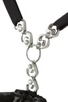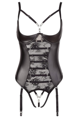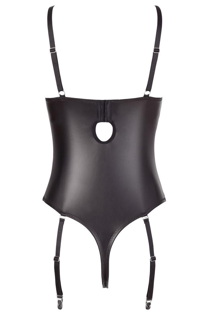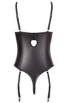 Beautiful design with ingenious insights! Sensual string body with adjustable and detachable suspender straps and a slightly padded shelf bra with hook fastener at the back. With delicate strap details and elaborate rhinestones in the cleavage area. The semi-transparent lace inserts at the front allow lascivious insights. Above that, there are additional refined lacings with silver rings and stretchy straps. The crotch is completely open and features exciting strap details and rhinestones as well.