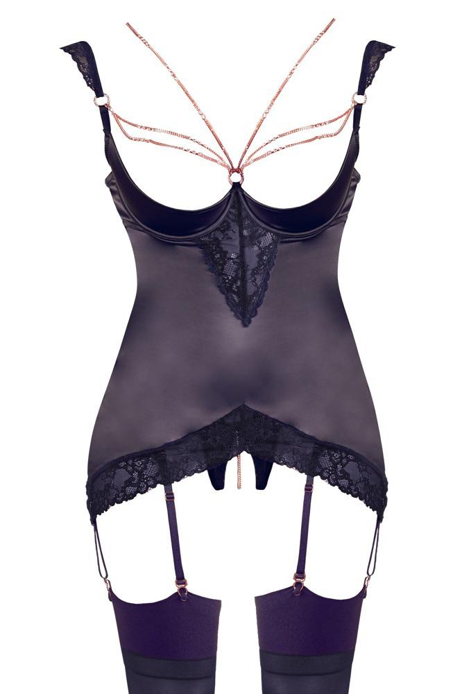 Seductive sight and a beautiful look! This sensual basque with a shelf bra has adjustable and removable suspender straps, and slightly padded, underwired cups. The basque also has a hook fastener at the back. With fancy lace details and elaborate rhinestone decoration in the cleavage area. The rhinestone decoration runs up three thin little chains on both sides. The chains go over the breasts and also go right up to the neck in a halterneck style. There are also additional lace inserts on the front of the basque, on the straps and on the hem. The matching string is crotchless and invitingly open. It also has a little chain that sensually stimulates with every step taken. This chain can be removed thanks to the snap hook - just like the chains on the basque itself.