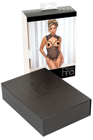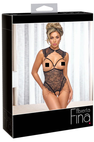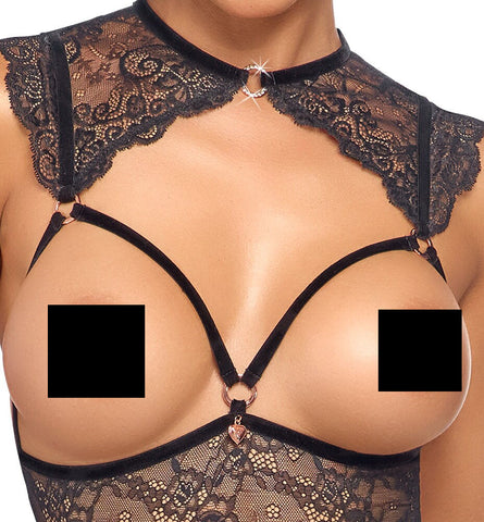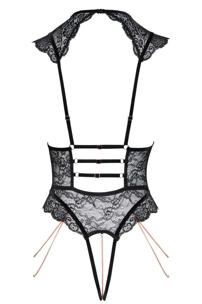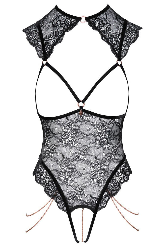 Sensual sophistication! The crotchless, black body from Abierta Fina is made out of soft & stretchy floral lace. The stretchy velvet straps and rose gold-coloured accessories emphasise the elegant, revealing look. It has seductive open cups and lace covering the shoulders. There is a sparkly rhinestone ring at the front of the neck and a small hook fastener at the back of the neck. There is also a beautiful heart-shaped pendant between the open cups. The open cups are framed by stretchy straps. There are 2 detachable thigh chains on the leg holes. The leg holes are in a high-leg design. The stimulating chain over the open crotch is also detachable. The bra straps and the 3 stretchy velvet straps at the back can be adjusted to fit.