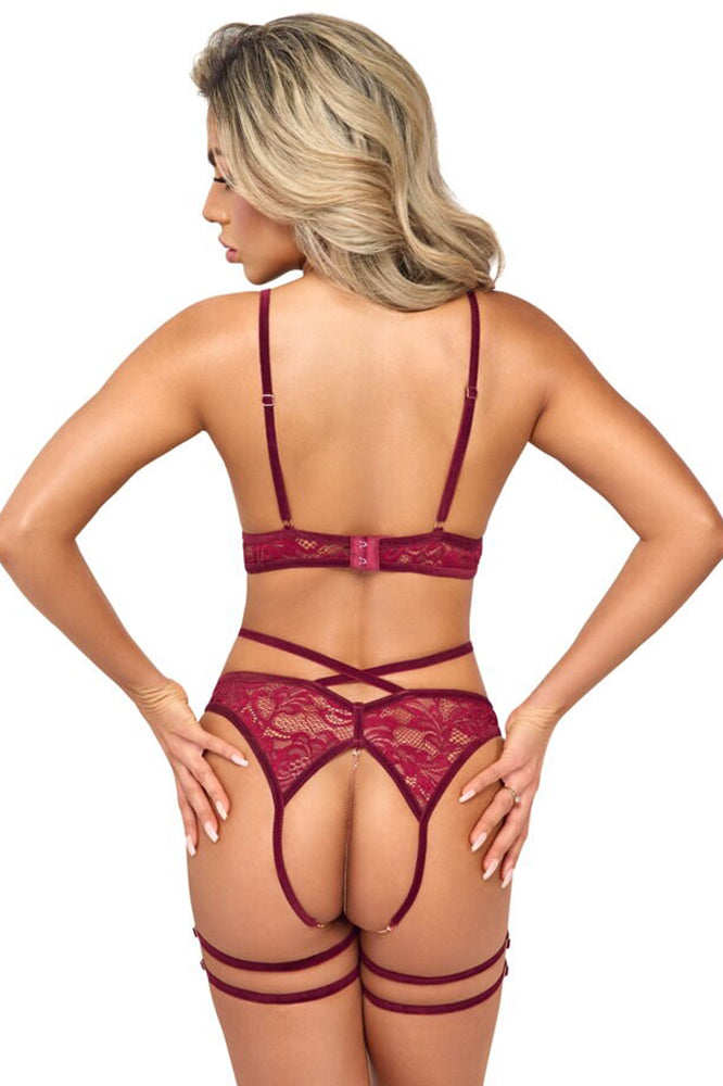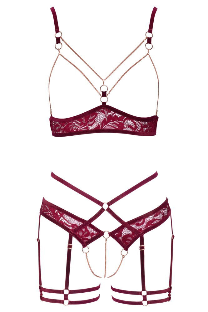 Extremely erotic elegance! The exciting set from Abierta Fina contains an open cup bra and crotchless suspender briefs. The delicate dark red lace is seductively emphasised by the velvet straps and rose gold-coloured accessories. It is soft and stretchy for a very comfortable fit. The decorative chains frame the uncovered breasts. The 3 removable chains over the open crotch area provide stimulation with every step. The bra straps and the hook fastener at the back can be adjusted to fit. The briefs in a suspender look have a velvet, waist-high waistband. The velvet suspender straps with double thigh straps can also be adjusted.