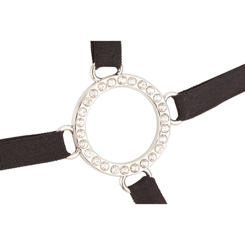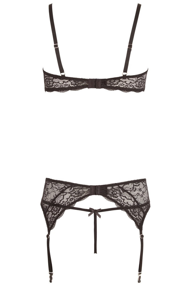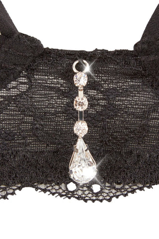 Extravagant seduction! 3-piece suspender set made out of delicate black lace. The underwired bra with beautiful rhinestones at the front looks extremely sexy and is wonderful decoration for the otherwise naked breasts. It also has a rhinestone ring over each nipple that is attached to straps (adjustable). The suspender belt´s sparkly rhinestone fastener at the front makes it look very seductive and the string is invitingly open in the crotch area! The bra and suspender belt have a hook fastener at the back. The bra straps, suspender straps and cup straps are adjustable.