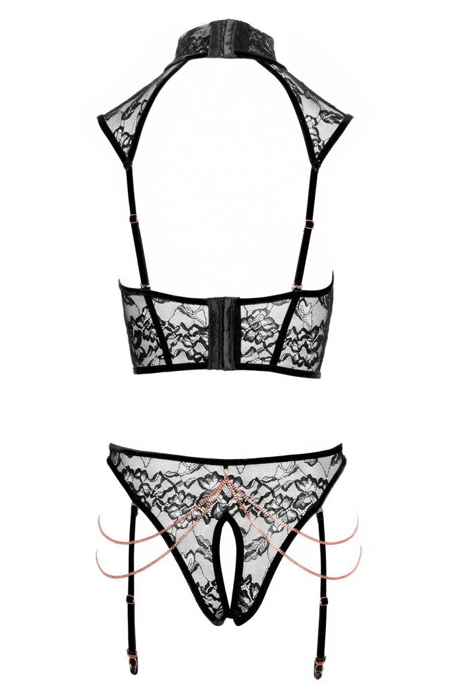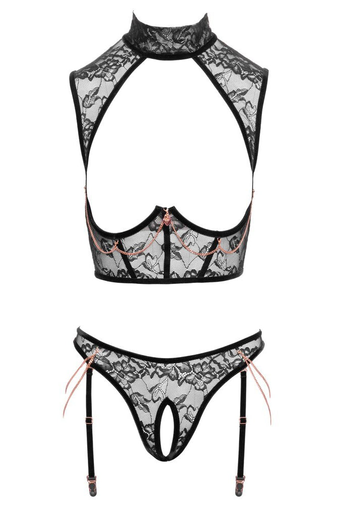 Sensual floral lace with provocative details! The exciting crotchless set from Abierta Fina is made up of an open cup top and crotchless suspender briefs. The delicate black floral lace is seductively accentuated with velvet details and rose gold- coloured chains. The set is soft and stretchy for a very comfortable fit. The top has underwired cups for a perfect open cup fit and it also has an adjustable hook fastener at the back. The stand-up collar with a hook fastener, the shoulder lace and the adjustable bra straps can be removed – just like the chain, with a decorative heart-shaped pendant, underneath the cups. The suspender briefs are in a very seductive thong style with high legs. The adjustable suspender straps and double chain trim at the back and on the sides can also be removed.