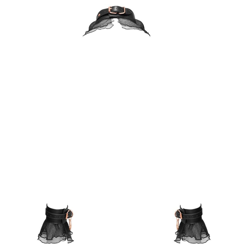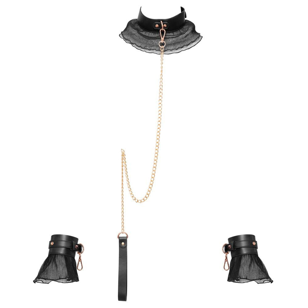 Rough and tender bondage feelings! The high-quality bondage set from Bad Kitty consists of a collar with leash and handcuffs. They are in a realistic leather look with delicate pleated frills and gold-coloured metal elements. All the restraints are comfortable and they can also be adjusted. Each handcuff has a ring and a snap hook. The collar with a ring has a removable chain leash with a snap hook and a hand loop.