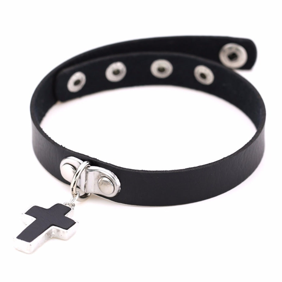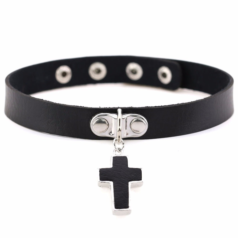 The choker features a silver tone Cross charm with black faux leather cross insert dangling from a central d-ring. The cross is approx. 3cm high and the band 18mm deep.