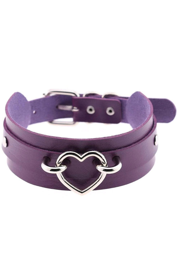 Purple Faux Leather Gothic Collar with Silver Tone Heart Ring Detail at the front.