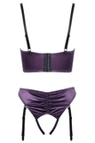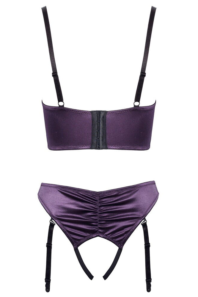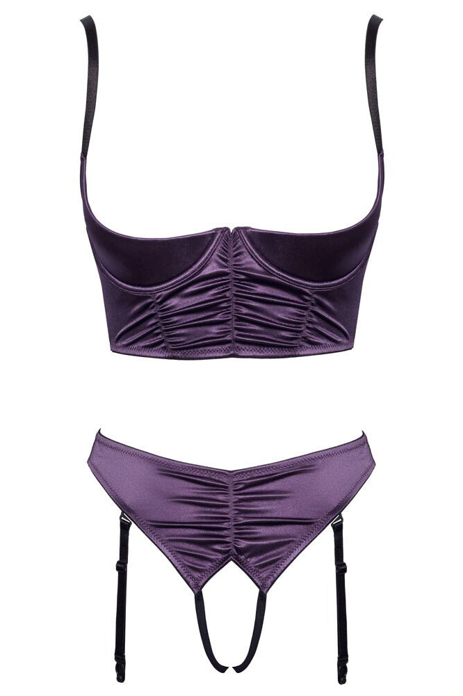 Opulent, gathered look in an elegant colour! Quarter cup bra and crotchless suspender thong in a set from Cottelli LINGERIE. Made from dark purple stretch satin in a classy gathered look with black details. The longer cut, underwired bra with lightly padded cups puts the bust in the spotlight and creates an irresistible eye-catcher. The straps and the hook fastening in the back are adjustable to fit. The suspender thong seduces with a completely open crotch. The suspenders are adjustable and can also be removed completely.