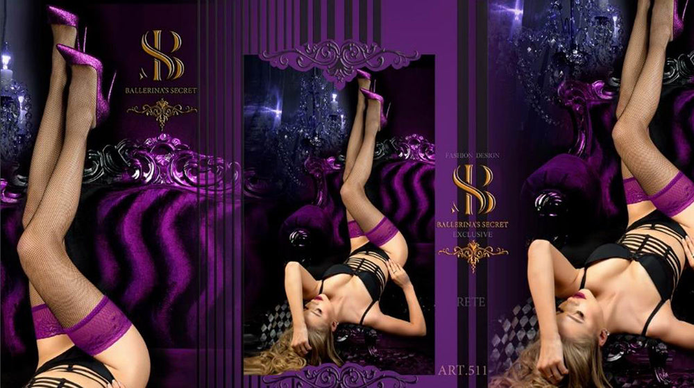 From the Ballerina Secrets Collection. This is a lovely pair of hold ups in black with a stunning contrast in Granata (Magenta) a very rich colour. The holds ups have a fishnet design with lovely lace top. An exclusive product which is delicately perfumed. Available in two sizes. The item is presented in beautiful Ballerina packaging.