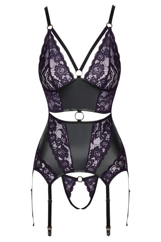 Beautiful material mix with sophisticated details! Basque and crotchless string in a set from Cottelli LINGERIE. Made out of black matte look material with lace inserts at the front in an elegant dark purple colour. The set is soft and stretchy which means that it is extremely comfortable to wear. There are decorative stretchy straps and a ring between the soft lace cups. There is also a silver-coloured ring over the cut-out that's around the front of the waist. There is another ring on the string's waistband too. The bra straps and the 6 suspender straps are adjustable. The double hook fastener at the back is also adjustable. The small string is seductively crotchless.