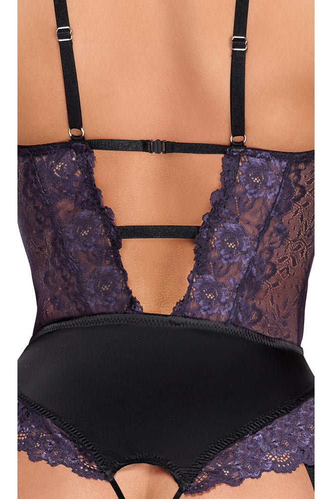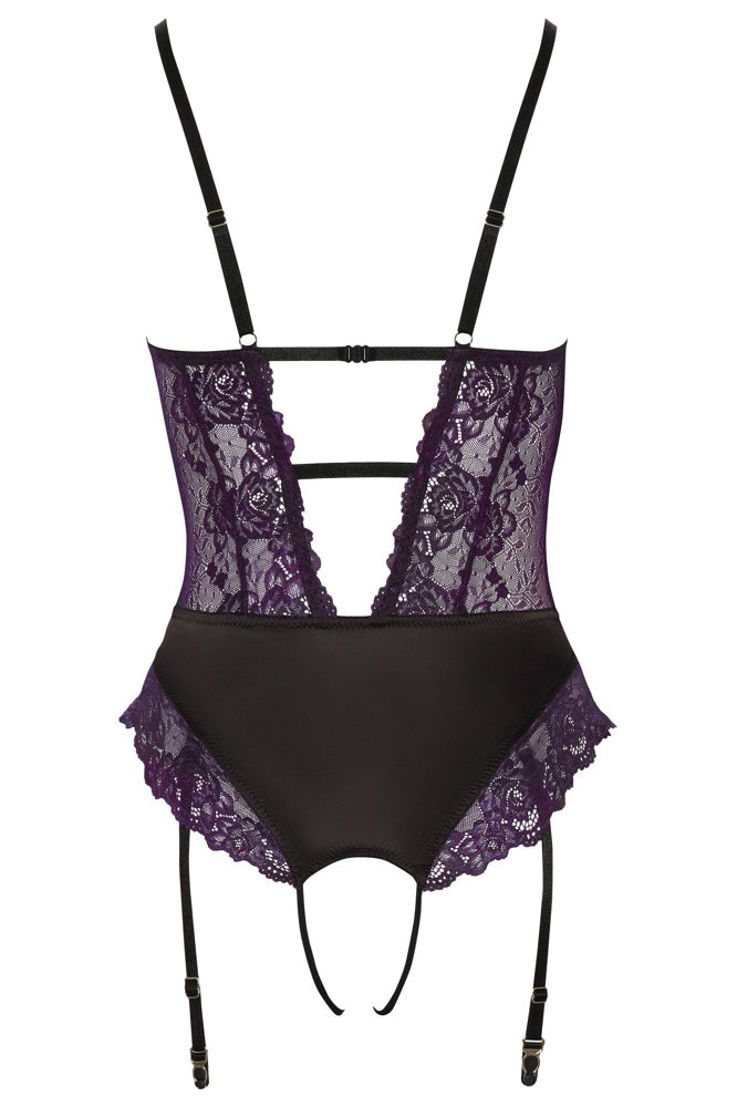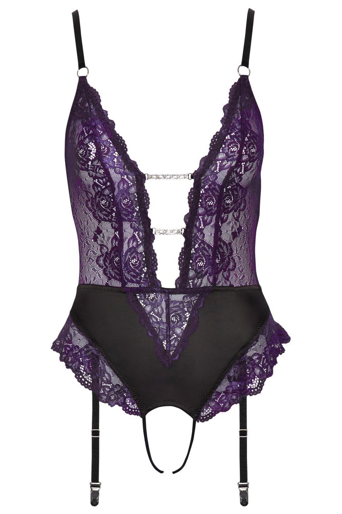 Super seductive crotchless body! Crotchless suspender body from Cottelli LINGERIE made of beautiful purple-coloured lace and black details. It is super soft and stretchy for high comfort. The plunging neckline features two glittering chains as a special eye-catcher. The plunging back cut-out offers two stretchy straps, of which one is adjustable. The straps and suspenders are also adjustable.