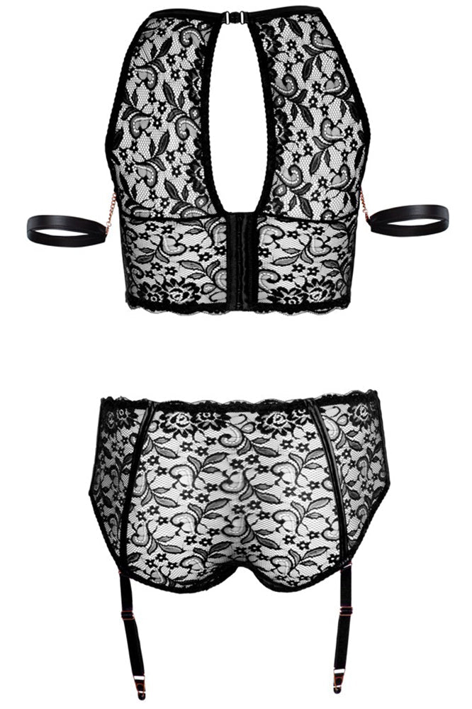 Delicate lace for captivating moments of pleasure! Bralette and suspender briefs made out of soft, stretchy lace combined with matte look material and rose gold-coloured details. The removable handcuffs are perfect for captivating moments of pleasure. The handcuffs have chains and a snap hook and are attached to the bratlette's neckline. The handcuffs also have practical hook and loop fasteners. The underwired bralette has a hook fastener at the back and a small clip fastener at the back of the neck. The adjustable suspender straps can be removed from the briefs.