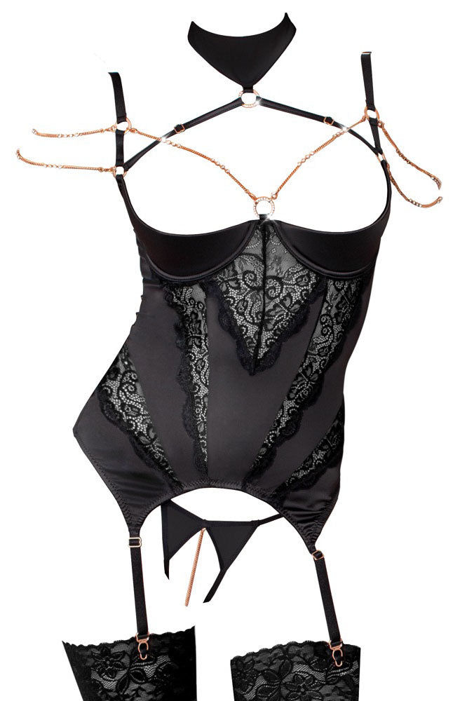 Sensational basque from von Abierta Fina made out of stretchy satin that has lace inserts that go down the basque and rose-gold coloured decoration. The integrated underwired shelf bra with slightly padded cups emphasise the beautiful breasts and make them the centre of attention. The two adjustable cleavage straps are fancy because they go from the adjustable bra straps to the choker. The choker has a hook and loop fastener. The chains over the breasts and shoulders are decorated with rhinestones and have snap hooks which means that they are removable. The small crotchless string made out of stretchy satin and a removable chain over the crotch is included.