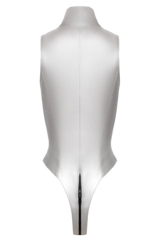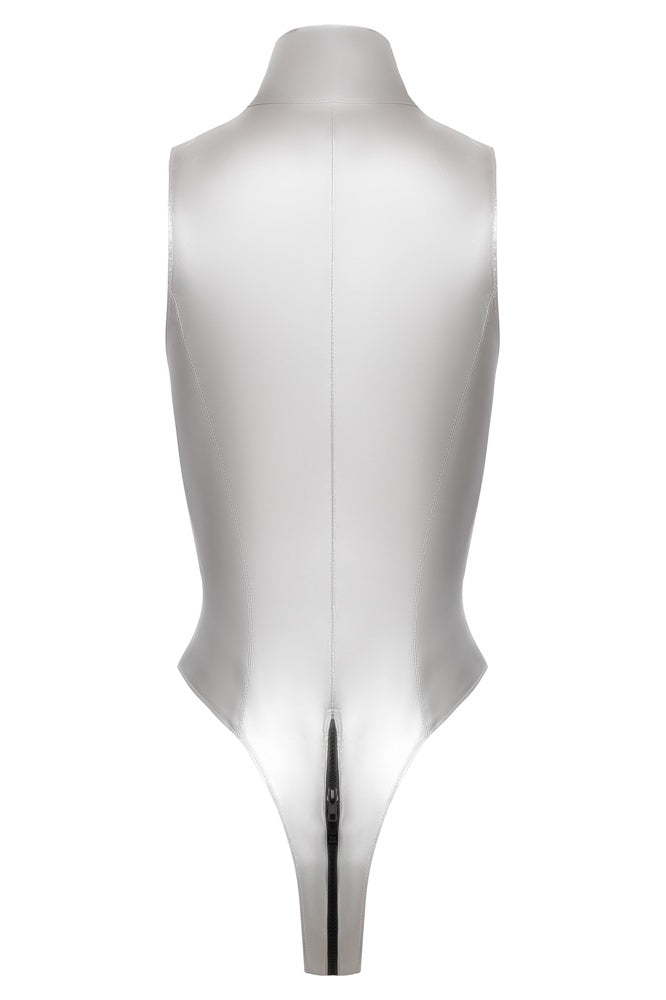 Eye-catching one-piece with a silver shimmer! Sleeveless body from Black Level in a completely silver-coloured vinyl shimmer. Close-fitting cut with high leg cut-outs and extravagant high collar with black lacing at the front. The black 2-way zip goes from the stylish neckline through the crotch to above the bottom. It can be opened from both sides.