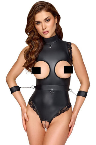 Captivating and crotchless! Sleeveless crotchless body from Cottelli BONDAGE with a removable restraint belt. Made out of smooth & stretchy black matte look material with lace decoration around the arm and leg holes. With silver-coloured accessories. It has a large stand-up collar with a restraint ring at the front. The body also has seductive open cups (cut-outs) and a removable, stimulating chain over the open crotch area. With a long, carefully integrated, 2-way zip at the back. The included arm restraints with their snap hooks chains can be hooked onto the restraint rings on the belt. The belt and the soft restraints can be put on and taken off quickly because of their adjustable hook and loop fasteners.