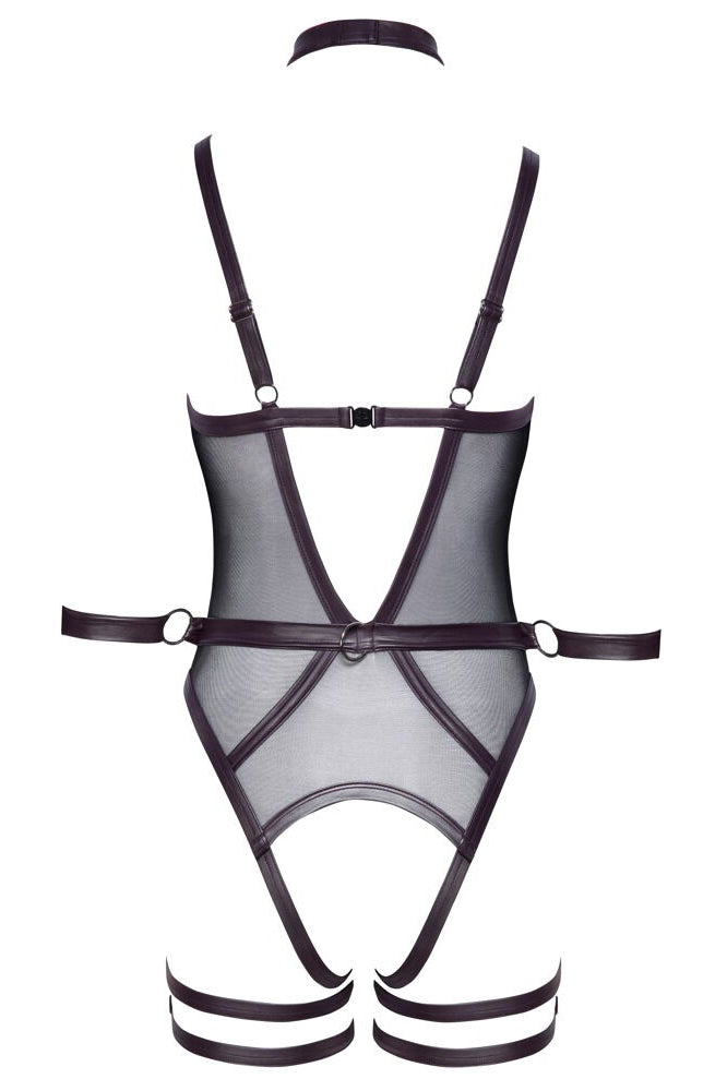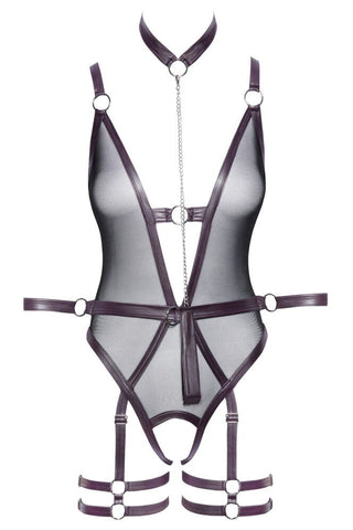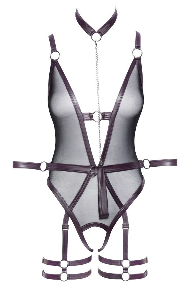 Body with captivating extras! The crotchless body from Cottelli BONDAGE has removable suspender straps and thigh harnesses. A collar with chain leash and two arm restraints for soft bondage games are also included! The body is made out of black powernet and it has decorative details in dark purple matte look material. It also has silver-colored accessories. It is low-cut at the front and the back. It is seductively crotchless too. With a hook fastener at the back and adjustable straps. The waistband has rings on it for the two included arm restraints. The restraints can be put on quickly, thanks to their hook and loop fasteners, and they can also be adjusted to fit. This is also like the included choker with the removable chain (with a snap hook) that can be used as a leash. The adjustable suspender straps and double thigh straps can be removed as well.