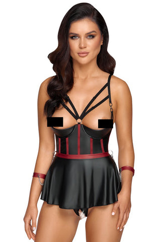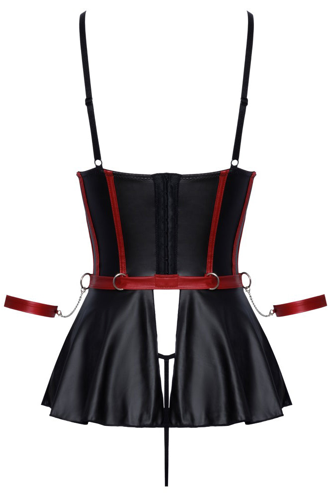 Crotchless set in an elegant captivating look! Longline, lift-up bra with flounce, crotchless thong and 2 arm cuffs in a set from Cottelli BONDAGE. In a sophisticated black matte look with red contrasting stripes in a waist-accentuating bodice look and silver-coloured details. The longline bra with its lightly padded underwire cups lifts the bust perfectly and presents it prominently with stretch straps. The flared skirt flounce, open at the back, sensuously plays around the hips. The straps at the front are decorated with decorative jewellery as additional eye-catchers. The straps, the neckline ribbons and the hook fastener at the back are adjustable. At the waistband there are 4 rings for the two included soft arm cuffs with their snap hook chains. The cuffs are adjustable with hook-and-loop fasteners. The matching small thong is invitingly open at the crotch.