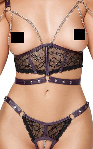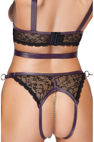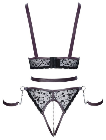 Revealing and captivating views! The crotchless set from Cottelli BONDAGE has an open cup top, crotchless briefs and two soft handcuffs. It is made out of a stylish mix of delicate black lace and dark purple matte look details. It also has silver-coloured accessories. The top frames the uncovered breasts with chains. The waist belt on the front ring can be adjusted with press studs. The bra straps can also be adjusted. With an adjustable hook fastener at the back. The briefs have a removable, stimulating chain over the open crotch area. Adjustable waistband with press studs. The restraints can be hooked onto the rings that are either side of the waistband. The restraints have chains with snap hooks. The soft restraints can be put on and taken off quickly, thanks to their hook and loop fasteners.
