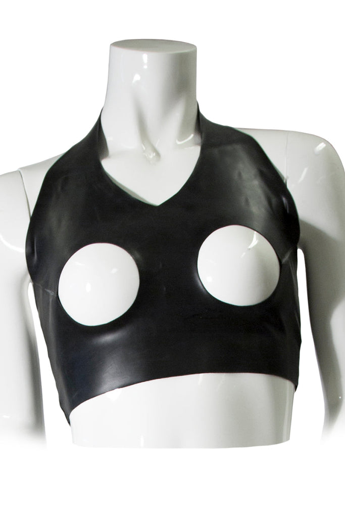 A halter top in shiny black Datex from the Guilty Pleasure Fetish Wear collection with cut-out breast openings. This breast exposing halter top fits tightly around the body, while it’s still easy to put on or take off, thanks to the stretchy nature of Datex with the soft elastic fabric inside that slides over the skin easily.
