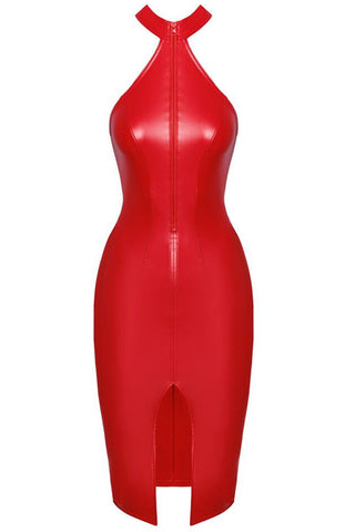 Sexy, bright red dress that is comfortable to wear! The cold shoulder, knee-length dress from Noir is in a tapered design. It is made out of powerwetlook that clings sexily to the body. It is in a great colour: bright red. It is also soft and stretchy for a very comfortable fit. There is a full-length zip from the stand-up collar to the long slit.