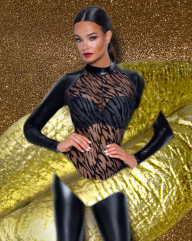 Provocative jumpsuit in an exclusive design! Long sleeve jumpsuit from Noir that is completely made out of power wet look. There is a transparent powernet insert at the front with a delicate velvet flock print in a tiger design. Everything is stretchy and fits like a second skin! A special highlight is the practical, erotic 3-way zip that starts at the back of the neck and goes over the crotch.