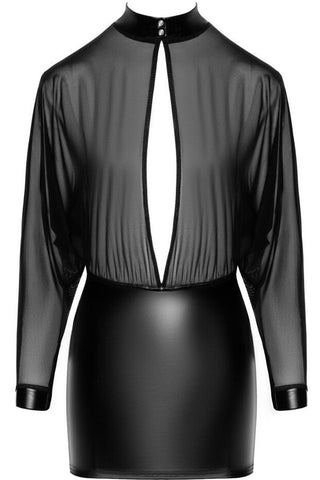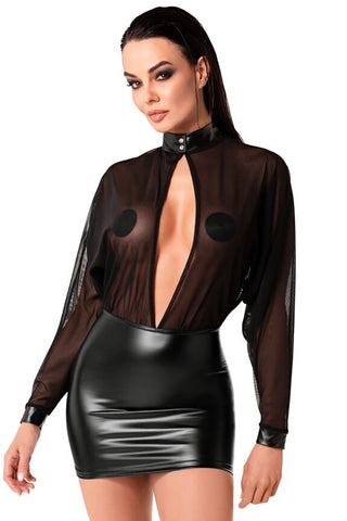 Design: The mesh top features a snap-button collar and cuffs made from the same Wetlook fabric as the skirt, tying the two elements together. The open back and plunging front add an edgy twist to the elegant design, making it perfect for both daring outings and intimate settings.
