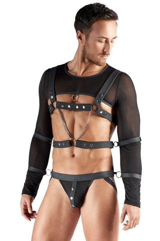 A captivating look with lots of extras! The black set from Svenjoyment BONDAGE contains a crop top, chest harness, jock and 4 handcuffs/arm restraints. The open chest crop top and the open back jock are made out of soft and stretchy powernet and have decorative matte look details as well. The top also has long sleeves and a ring at the front. The jock has a row of press studs over the pouch. The harness has adjustable matte look straps (press studs), chains and rings. There are rings at either side of the stomach strap and the jock's waistband, which can be used for attaching the included restraints. The soft restraints can be put on quickly and adjusted with the hook and loop fasteners.
