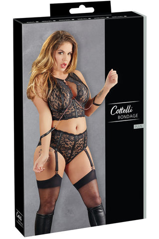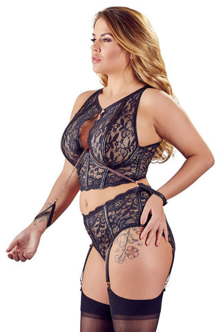Delicate lace for captivating moments of pleasure! Bralette and suspender briefs made out of soft, stretchy lace combined with matte look material and rose gold-coloured details. The removable handcuffs are perfect for captivating moments of pleasure. The handcuffs have chains and a snap hook and are attached to the bratlette's neckline. The handcuffs also have practical hook and loop fasteners. The underwired bralette has a hook fastener at the back and a small clip fastener at the back of the neck. The adjustable suspender straps can be removed from the briefs.