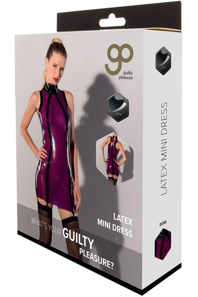This fuchsia latex dress has a black turtle neck and black stripes as decorations. At the front and back of the dress the stripes end in garter straps, with metal clips to attach stockings to the dress. The latex mini dress from the Guilty Pleasure collection closes with a zipper at the back side.