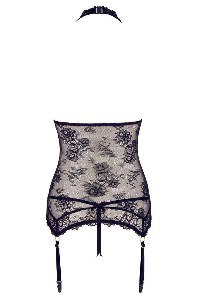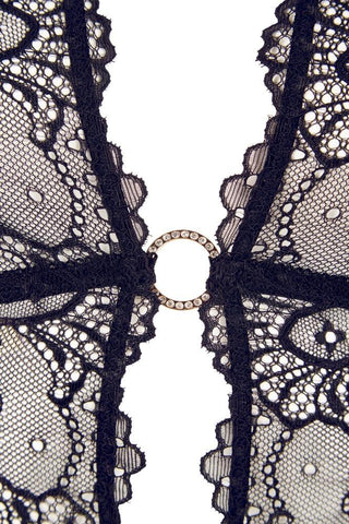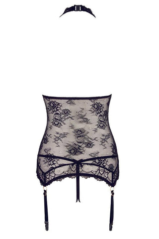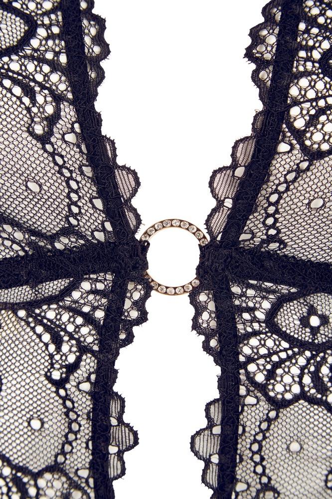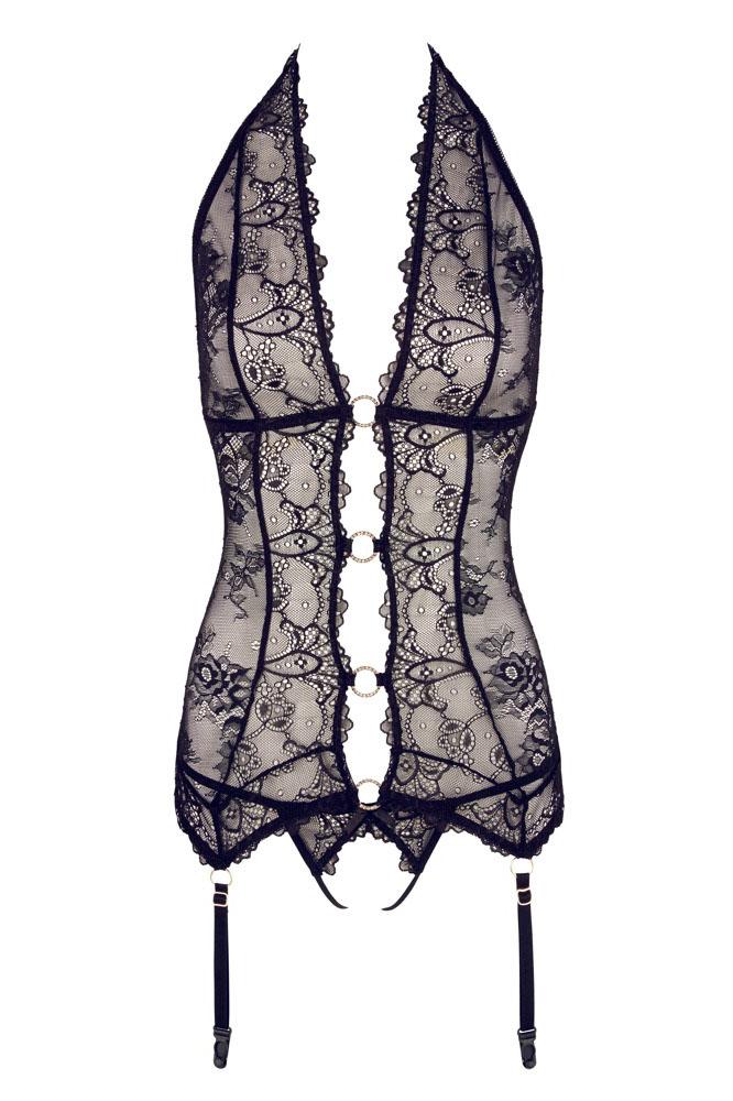 The transparent look awakens desire! The black halterneck basque is made entirely out of fancy lace and its completely open front is extremely mesmerizing. The front is only held together by four gold-coloured rhinestone rings. The soft material is extremely comfortable to wear and the four suspender straps attached to the lace hem are adjustable. The matching string is invitingly open in the crotch area.