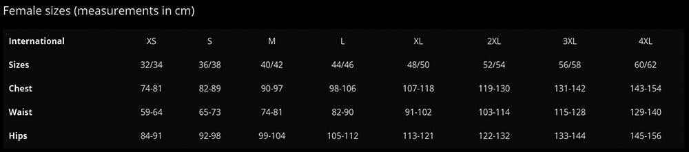 Female sizes (measurements in cm)