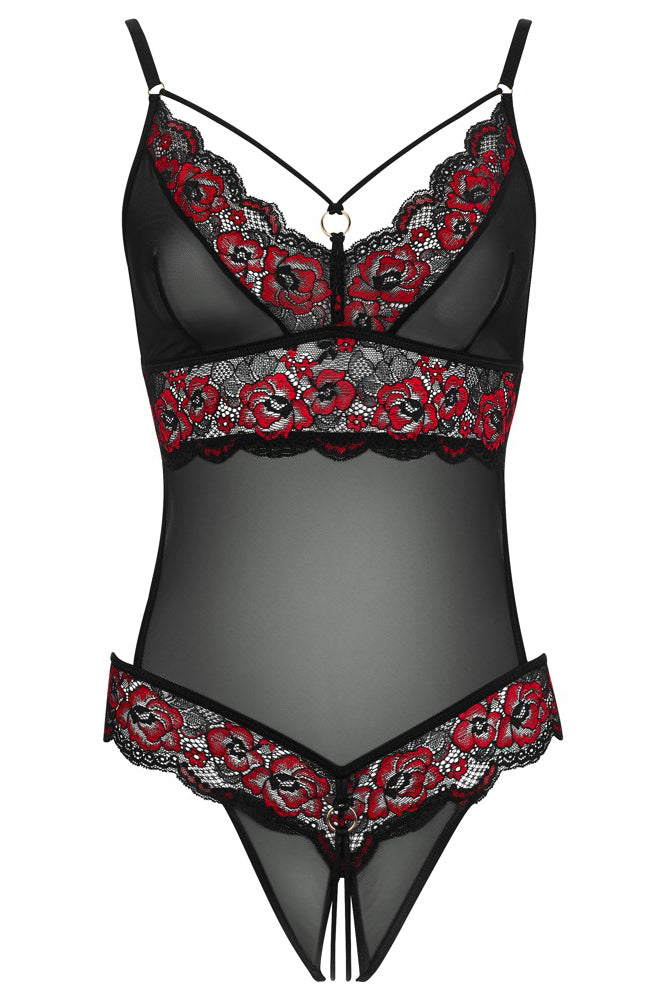Very seductive floral lace! Body from Cottelli LINGERIE made out of floral lace that is in two different colours. There is also transparent powernet on the cups and over the stomach. There are stretchy straps and decorative rings in the cleavage and waist area. It is invitingly open in the crotch area. It is in a two-piece design at the back. The straps can be adjusted for a perfect fit.