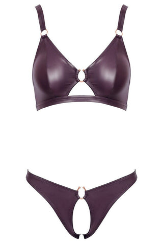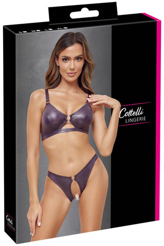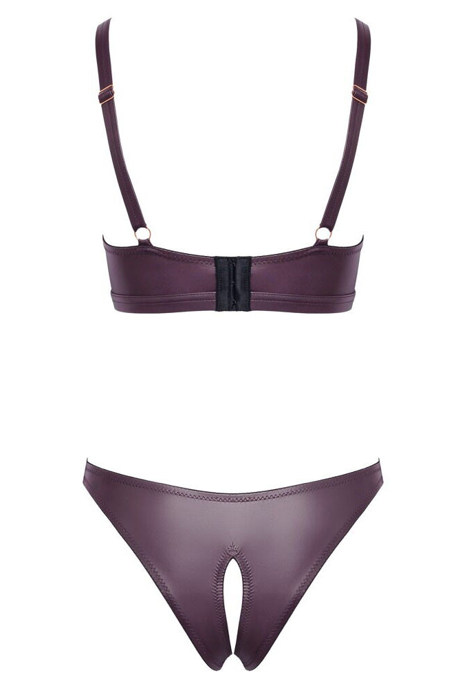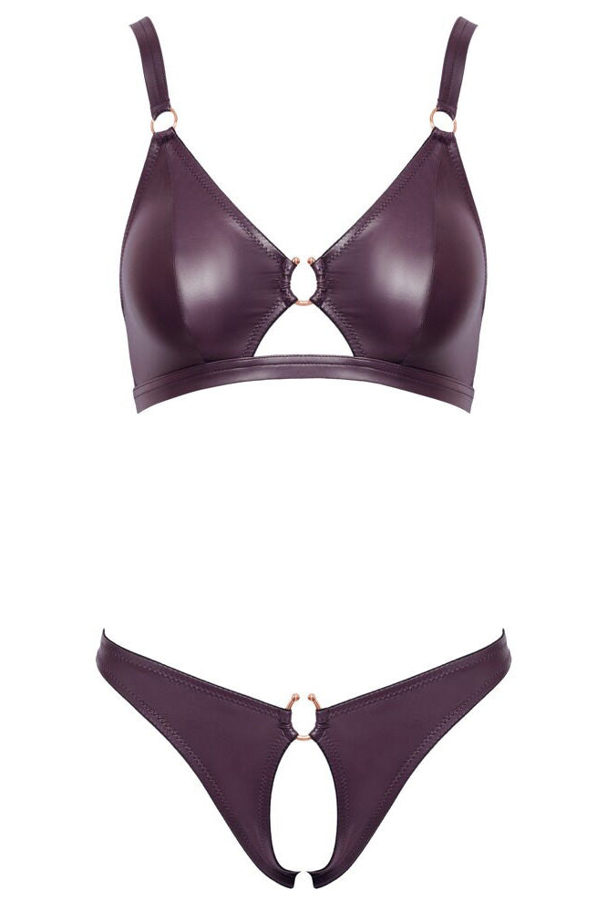 Erotic wet look style in an amazing colour! The wireless bra and briefs set from Cottelli LINGERIE. The bra and briefs are made out of purple wet look material – soft and stretchy for a comfortable fit. It has a fancy design with beautiful rose gold-coloured ring accessories. There is a hook fastener at the back of the bra to adjust it. The straps can also be adjusted to fit. The seductive briefs are crotchless.