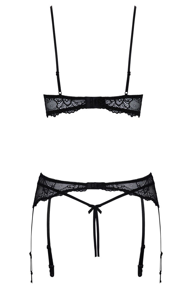 Elegant and erotic with glittery details! Shelf bra, suspender belt and crotchless thong combined in a set by Cottelli LINGERIE. All made from fine, soft black stretchy lace; the bra and suspender belt are decorated with shimmery rings. The lightly lined bodice shows off the bust – it beautifully framed and supported by elastic cup straps and underwires. The straps and hook fastening at the back are adjustable for a perfect fit. Narrow waist suspender belt with 6 adjustable suspenders and hook fastening at the back. The small lace thong seduces with its open crotch.