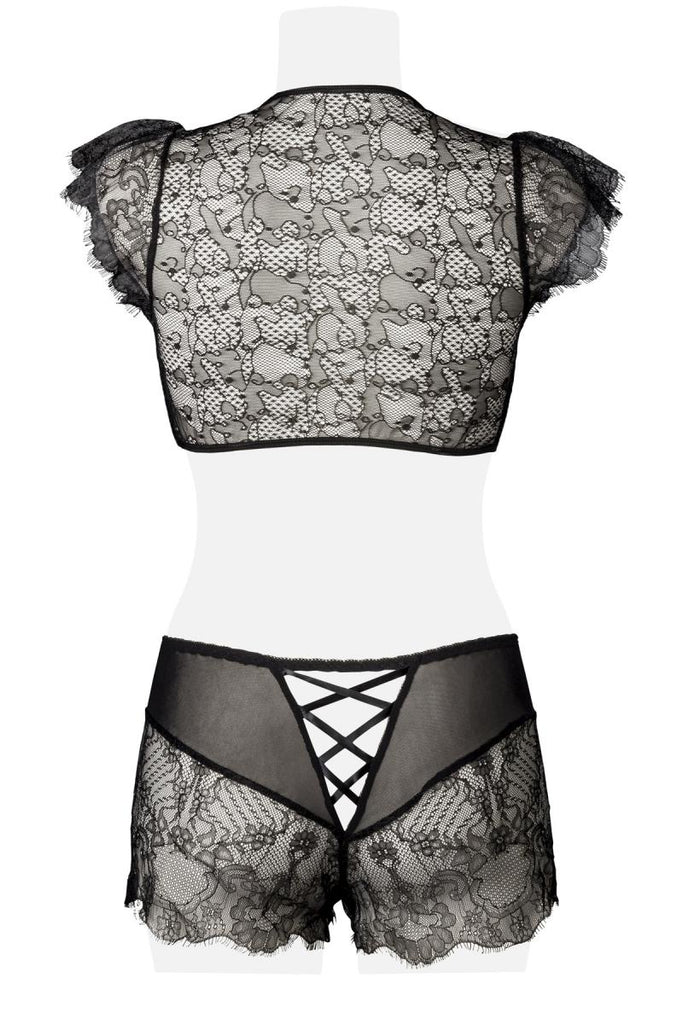 The set features a captivating jacket, adorned with delicate floral lace that dances across the transparent fabric. The jacket ties at the center front, creating a playful and alluring silhouette. The short sleeves add a touch of vulnerability, while the included transparent briefs with a laced optic at the back provide a tantalizing contrast.