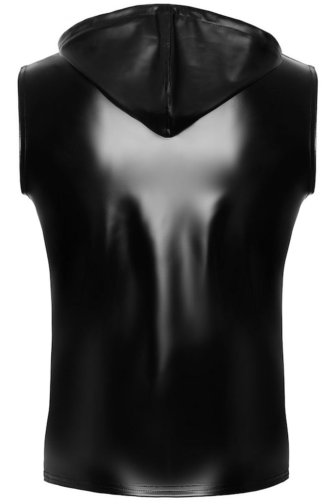 The sleek, shiny finish of the wetlook material is both eye-catching and modern, while the sleeveless design adds a touch of unexpected boldness. Perfect for layering over a tank top or wearing solo, this hoodie is incredibly versatile. The adjustable hood with drawstrings provides both style and functionality, allowing you to customize your look.