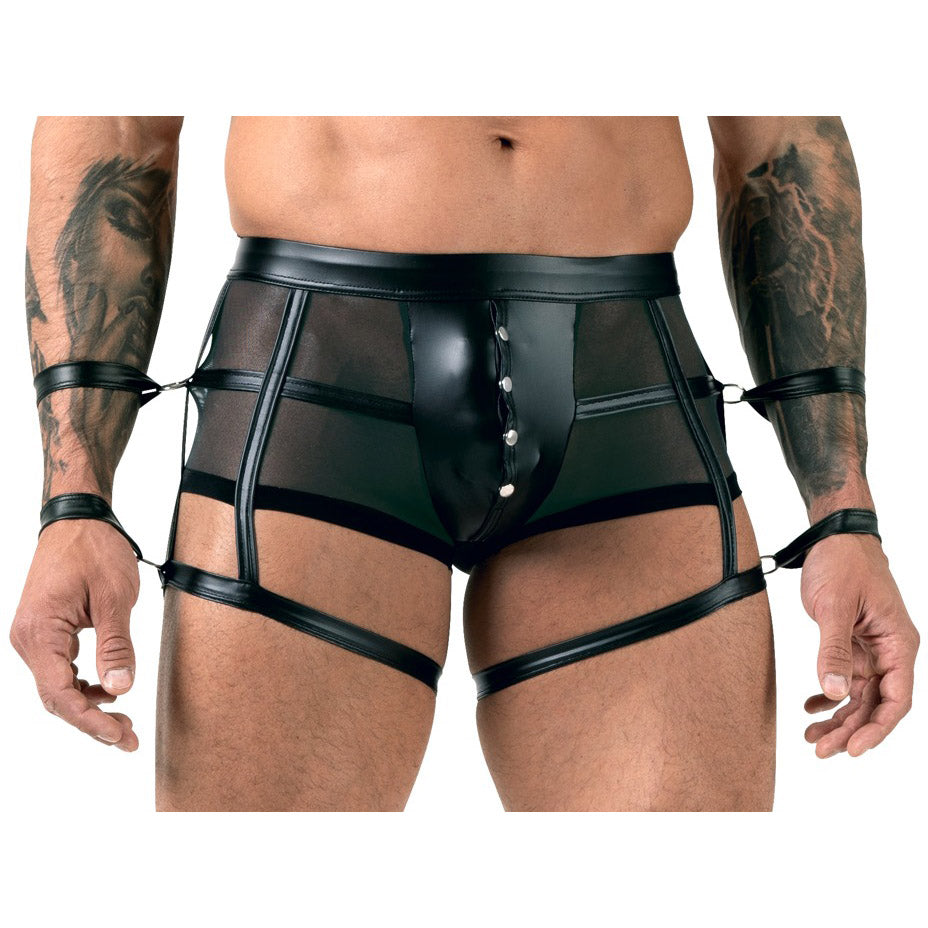 An exclusive, captivating design! Black pants from Svenjoyment Bondage made out of transparent powernet combined with beautiful matte look material. Tight-fitting but stretchy for a comfortable fit. The pouch has press studs which means that it can be opened erotically. There are two rings at either side with handcuffs and arm loops attached to them – the arm loops are attached to the pants and the handcuffs are attached to the thigh straps. The restraints are removable and have hook and loop fasteners.