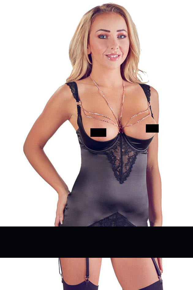 Seductive sight and a beautiful look! This sensual basque with a shelf bra has adjustable and removable suspender straps, and slightly padded, underwired cups. The basque also has a hook fastener at the back. With fancy lace details and elaborate rhinestone decoration in the cleavage area. The rhinestone decoration runs up three thin little chains on both sides. The chains go over the breasts and also go right up to the neck in a halterneck style. There are also additional lace inserts on the front of the basque, on the straps and on the hem. The matching string is crotchless and invitingly open. It also has a little chain that sensually stimulates with every step taken. This chain can be removed thanks to the snap hook - just like the chains on the basque itself.
