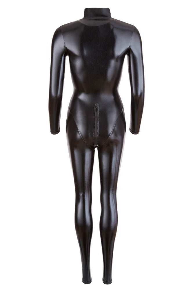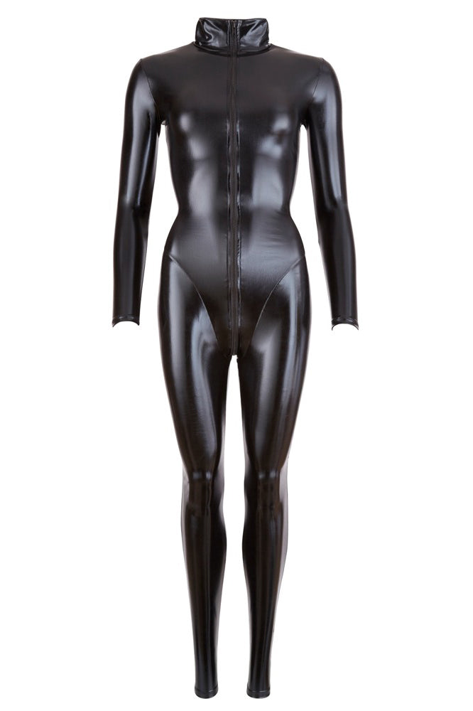 Fits like a second skin! This black jumpsuit has long sleeves and legs, a stand-up collar and it also covers her entire body, however that doesn't mean that it´s not a sexy outfit. The stretchy material is tight-fitting and really emphasises her breathtaking curves. The wide 2-way zip starts at the neck, goes over the crotch and stops at the top of the buttocks.