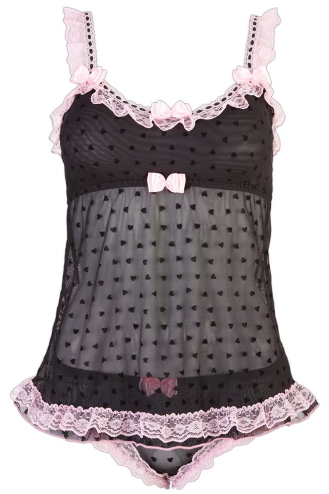 So sweet! Top and panties made out of transparent, black fabric with decorative hearts. Rose-coloured lace and decorative bows finish off the sweet look. The slightly flared top has an elastic seam under the bra part. The bra part is also made out of double-layered fabric. The straps are adjustable. Includes tight-fitting panties.