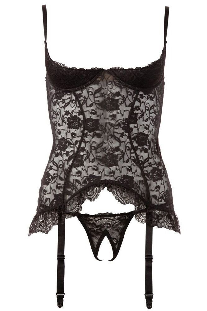 Tempting! Cami suspender made out of lace with slightly padded open cups. Hook-fastener at the back. The four suspender straps are adjustable and removable. With decorative ruffles on the hem. Includes a matching crotchless string.
