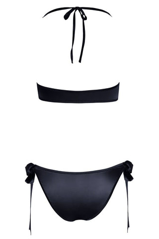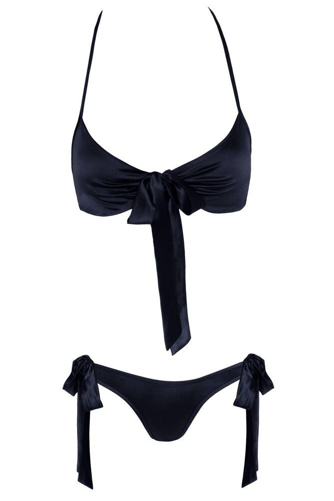 With a decorative bow that can be opened in the blink of an eye! Wireless bra and briefs from Cottelli LINGERIE made out of soft, silky and stretchy material. The bra has a halterneck that ties and also a bow that can be tied between the cups. The briefs can be tied together at either side.