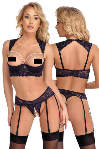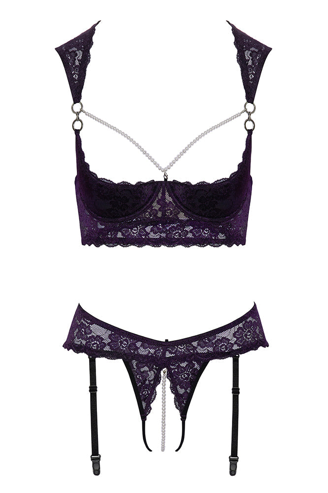 Fine lace, elegant colour, seductive details! Longline shelf bra and a crotchless suspender thong combined in a set by Cottelli LINGERIE. Made of dark purple lace with black details, garnished with silver-coloured rings and white pearls. The underwire lift with lightly padded cups lifts the bosom perfectly. The pearl necklace framing the bust is detachable with its small snap hooks. Sophisticated straps with lace on the shoulder section and a small clasp at the neck. The straps and hook fastening are adjustable to fit at the back. The suspender thong seduces with a stimulating pearl chain in the open crotch, which is removable – just like the adjustable 6 suspenders.