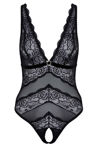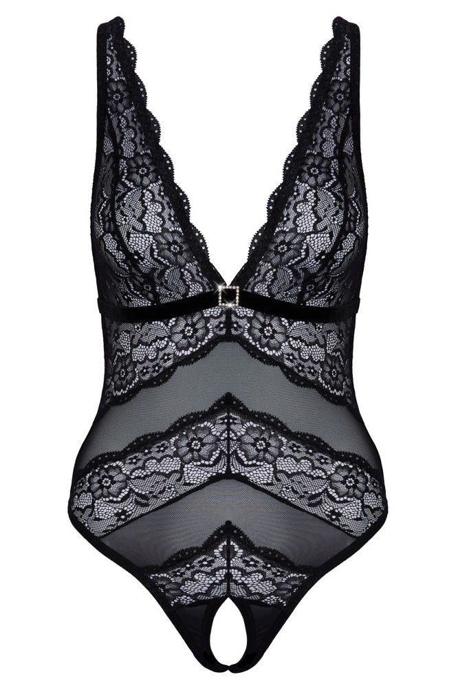Sensual style with that special something extra! Crotchless body from Cottelli LINGERIE in a delicate material mix of powernet and floral lace. With a beautiful deep neckline. A rhinestone element sparkles below the velvet underbust band. The crotch is seductively open. Powernet back with adjustable hook fastening. The straps are also adjustable for a perfect fit.