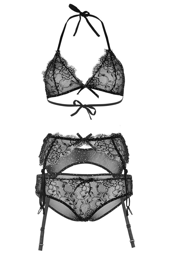 3 PC Eyelash lace rhinestone bra top, full back panty, and matching scalloped lace garter belt.