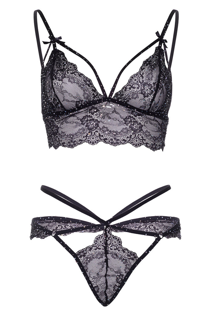 2 PC Scalloped lace rhinestone strappy bralette with adjustable straps, hook-n-eye back, and matching cut-out strappy g-string.