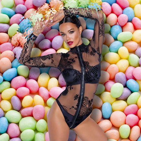 Delicate transparent material in an exclusive design! A long sleeve body from Noir that is made entirely out of stretchy powernet. The body is also covered in delicate velvet flock print in a floral design as well. The 3-way front zip goes from the stand-up collar right down to the crotch.