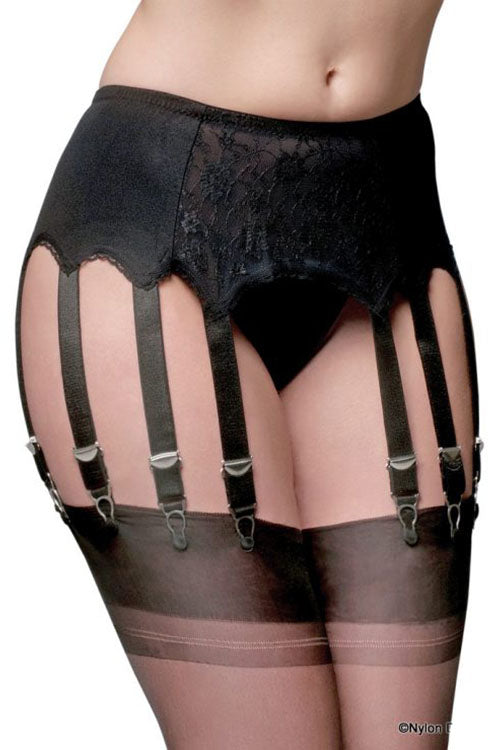 Black Nylon Dreams 12 Strap Suspender Belt lace front panel and plain Lycra side panels, metal clips and adjusters make this a very pretty retro suspender belt.