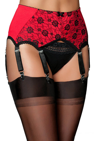 This is our new 6 Strap Pull On suspender belt features our high quality metal clips and adjusters. In Racy Red Lycra with a beautiful flower contrast lace there is no attachment at the back you just pull up and go. The suspender clips which click into place on your stockings mean they will only let go of your stockings when you decide.