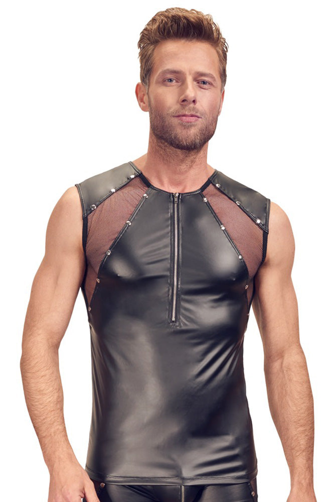 This shirt puts his muscles in the limelight! Sleeveless, figure-emphasising shirt made out of stretchy, black, matte look material with net inserts and striking stud decoration. With a zip at the front.