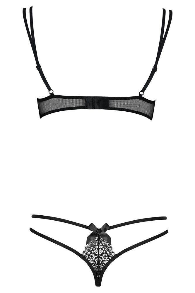 Extremely erotic and seductive set! Bra and G-string are made with delicate lace and decorated with small bows. The straps are adjustable.