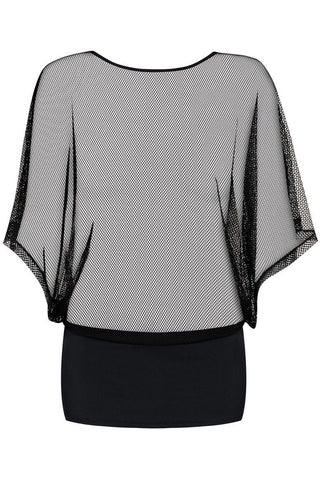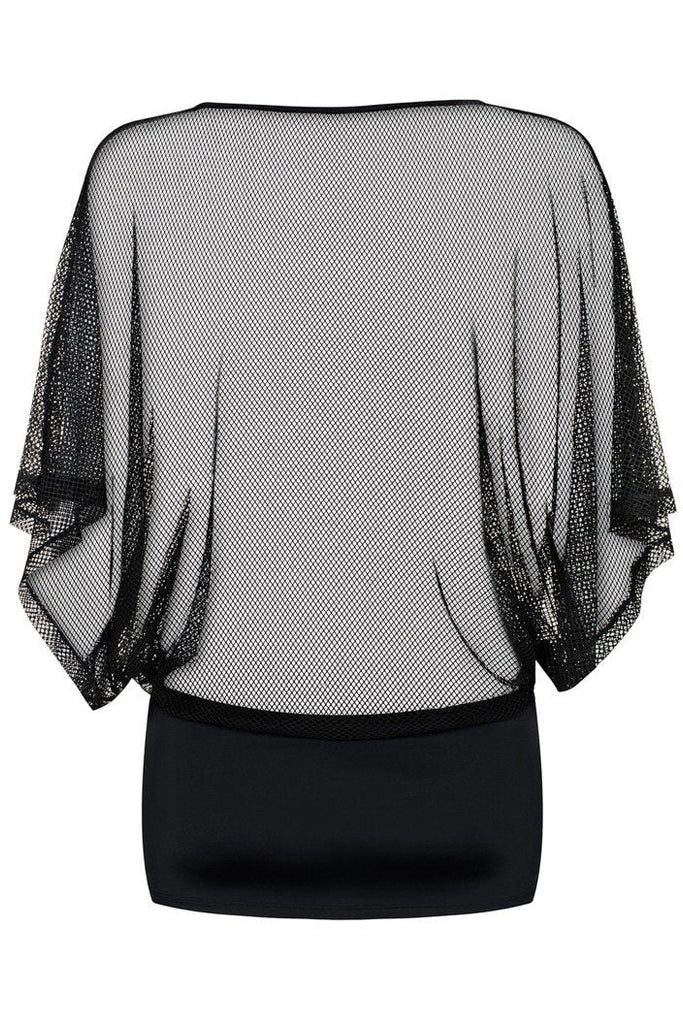 Sexy party outfit! This mini dress with a transparent, loose-fitting top part and a tight-fitting skirt part can also be combined very well with a pretty bra. A matching string is included. Black.